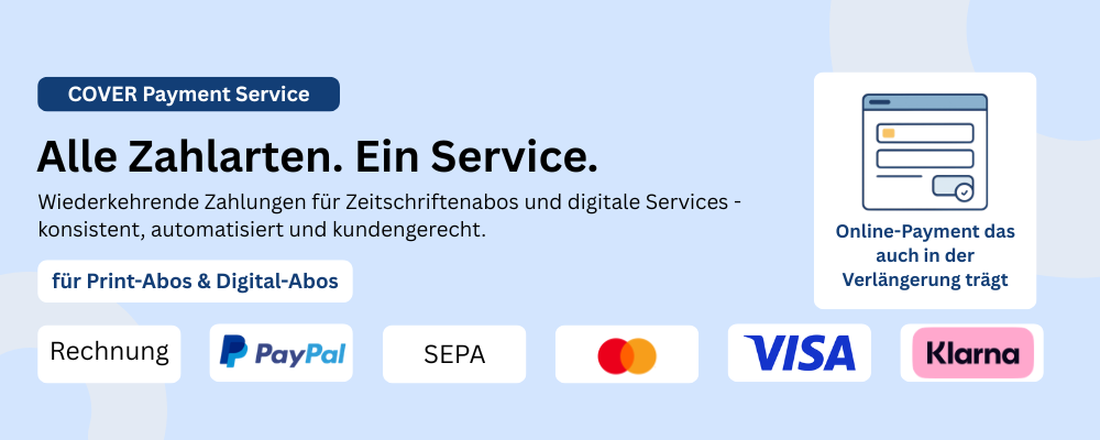 Der COVER Payment Service bietet eine Lösung, die modernes Subskriptions-Payment mit den spezifischen Anforderungen von Verlagen kombiniert. Die zentrale Plattform integriert Onlinezahlarten und klassische Verfahren und lässt sich nahtlos in Webseiten und bestehende Systeme einbinden.